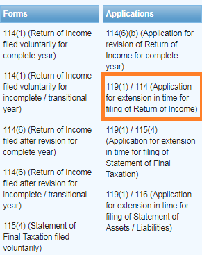 - A Vertical Drop Down Menu will open. Select “119(1) / 114 (Application for extension in time for filing of Return of Income)“.