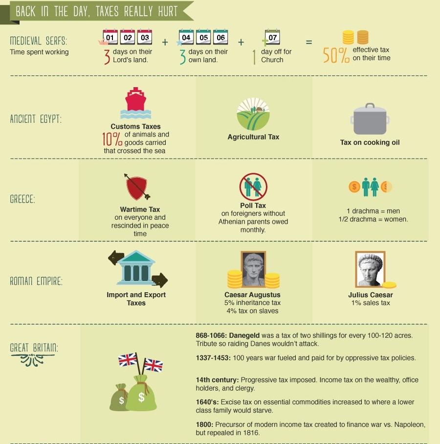 14th century: Progressive tax imposed. Duke of Lancaster taxed at 520 times more than a common peasant. Income tax on the wealthy, office holders, and clergy.