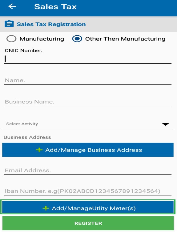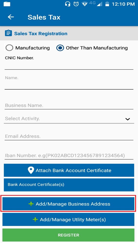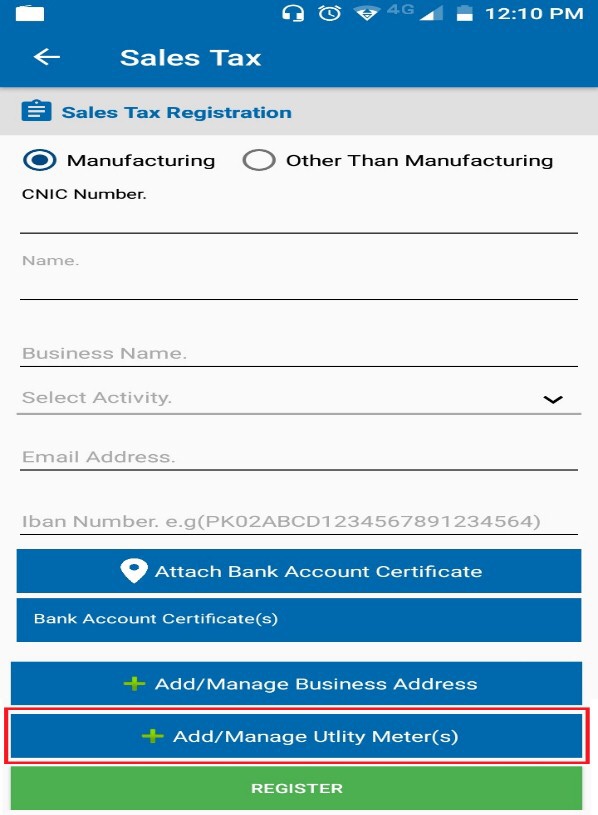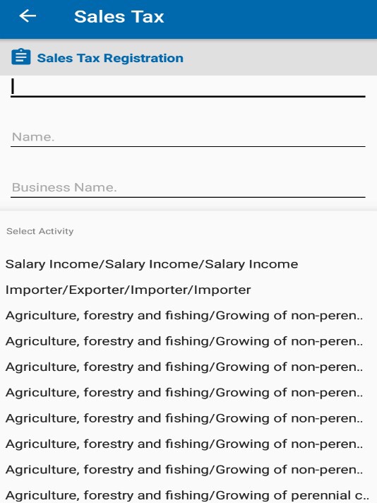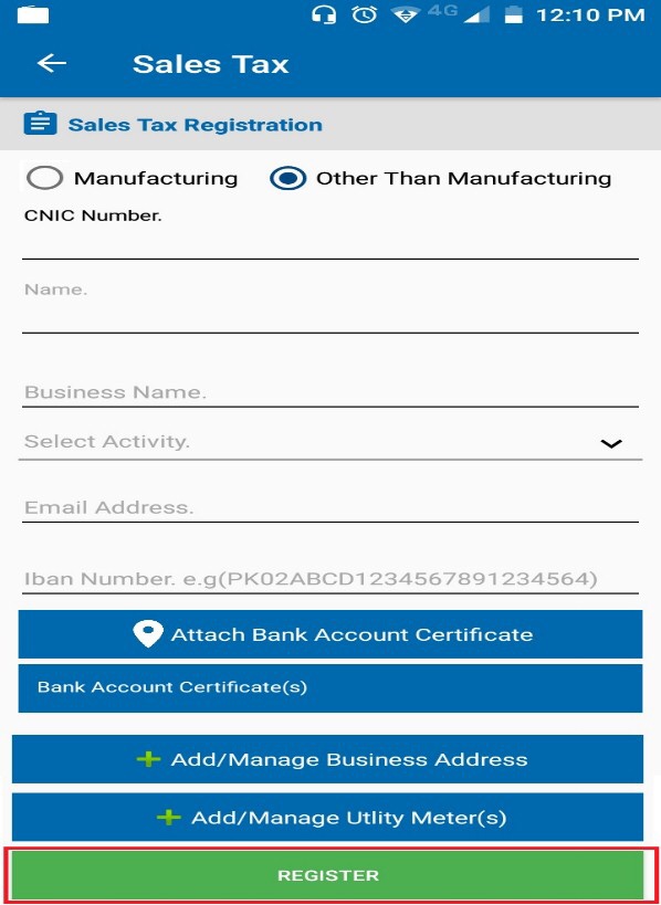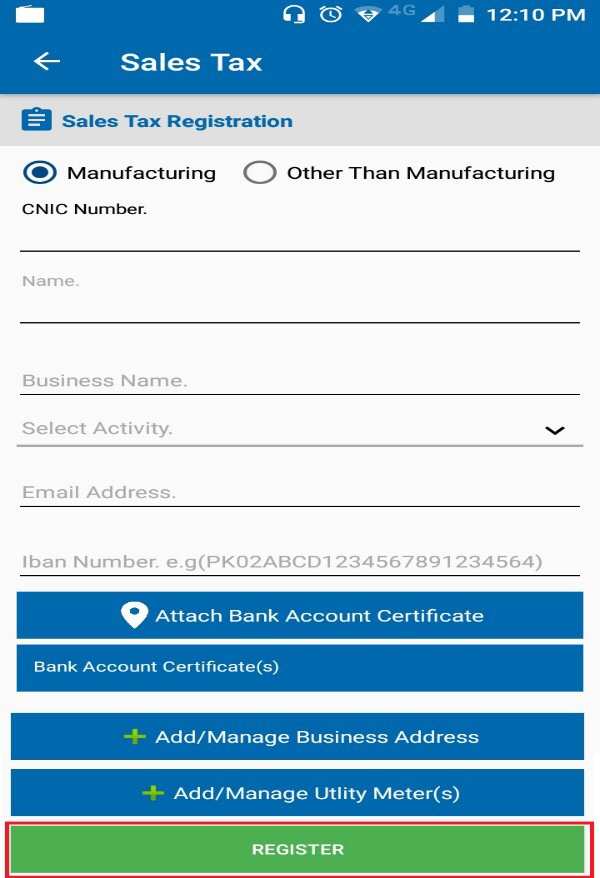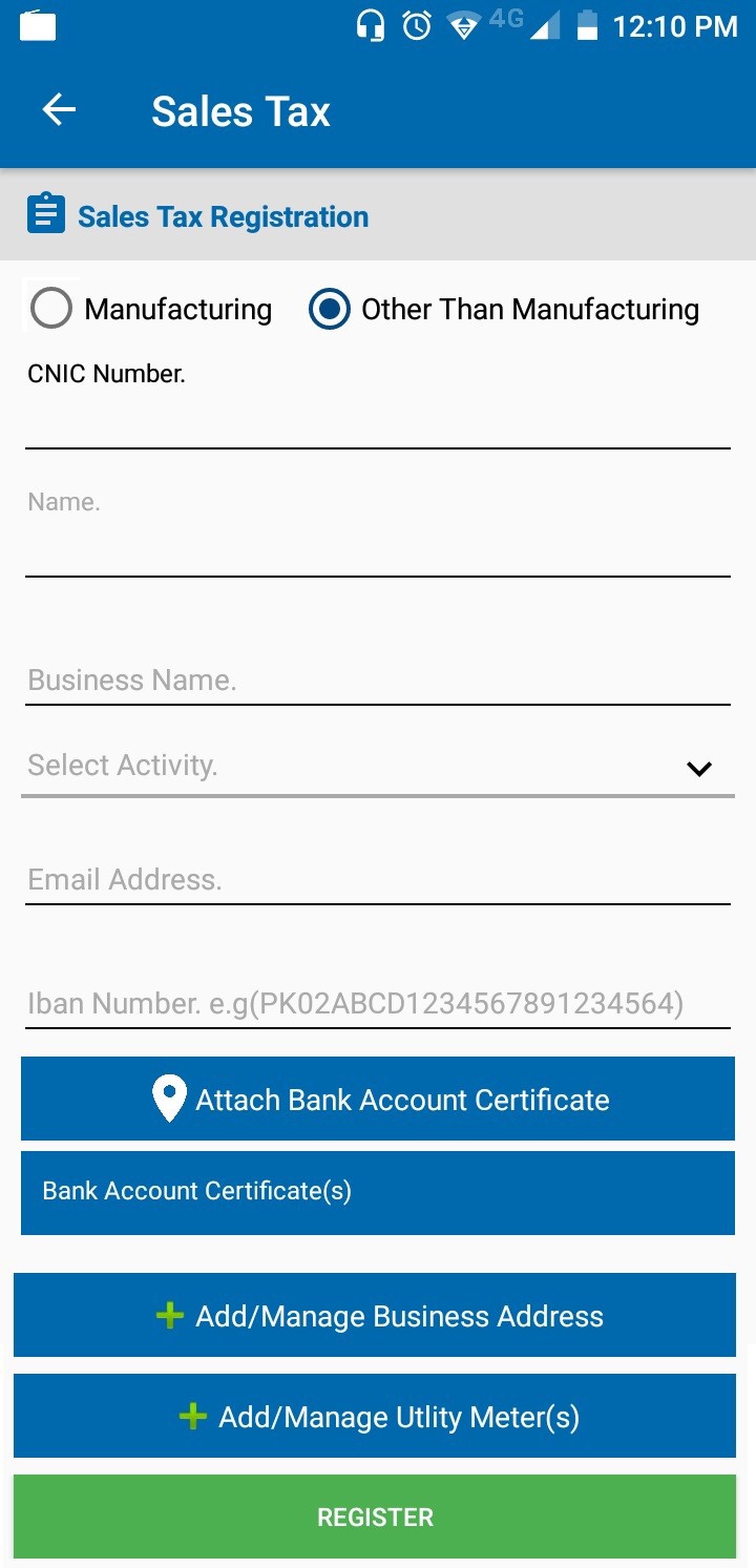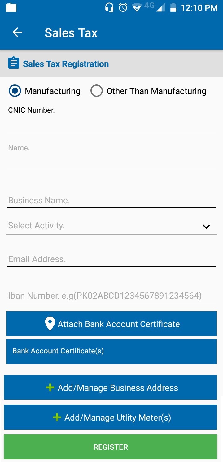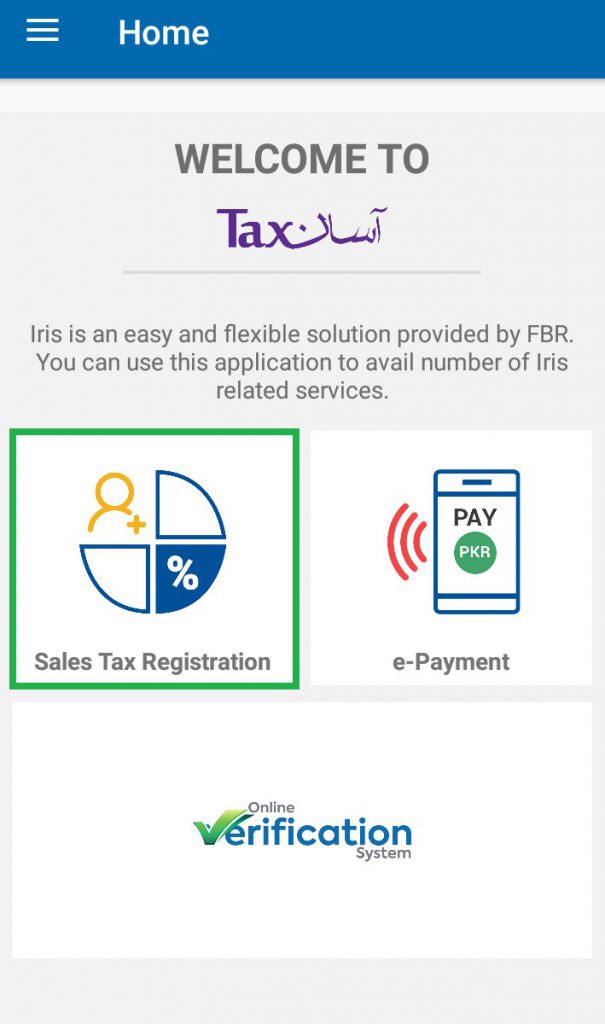 A new and simplified functionality is provided under Tax Asaan mobile application for the users to get register for Sales Tax. Now user can save time and instead of visiting RTO for sales tax registration they can simply fill in the registration form available on Tax Asaan mobile application. Tax Asaan ā Sales Tax Registration feature facilities both manufactures and other than manufacturer categories of sales tax. Soon after successful registration the user will be able to generate bank CPR for payments of dues. However, in order to file Sales Tax Return the user needs to get bio-metric verification within a month of sales tax registration by visiting e-Sahulat center of NADRA.
