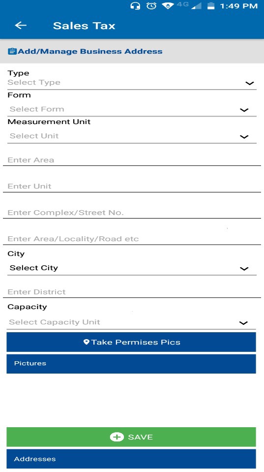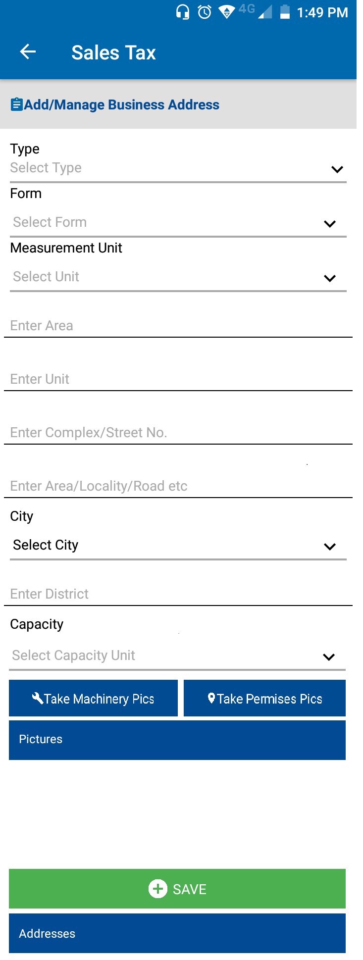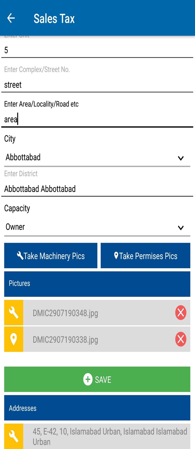 - After taking picture, click on Savebutton to add business address along with provided images. Please note that to add a business address at least one picture/image of premises is mandatory. User can add multiple Business Address by repeating same steps. All saved addresses will be listed under āAddressesā section provided under āsaveā button.