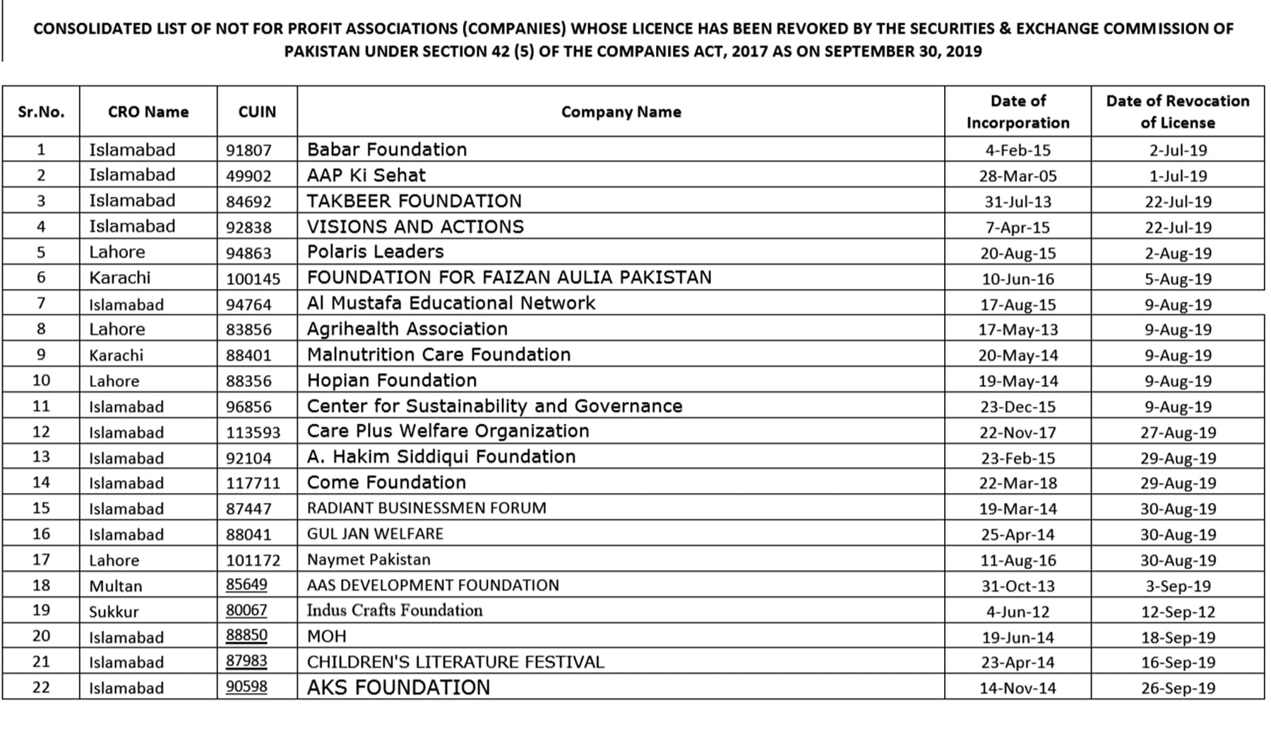 The Securities and Exchange Commission of Pakistan has revoked the licences of 22 ‘not-for-profit’ organisations for failing to provide financial details, a press release by the Commission said on Wednesday.