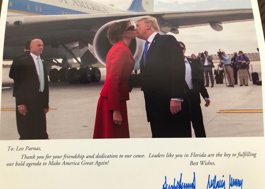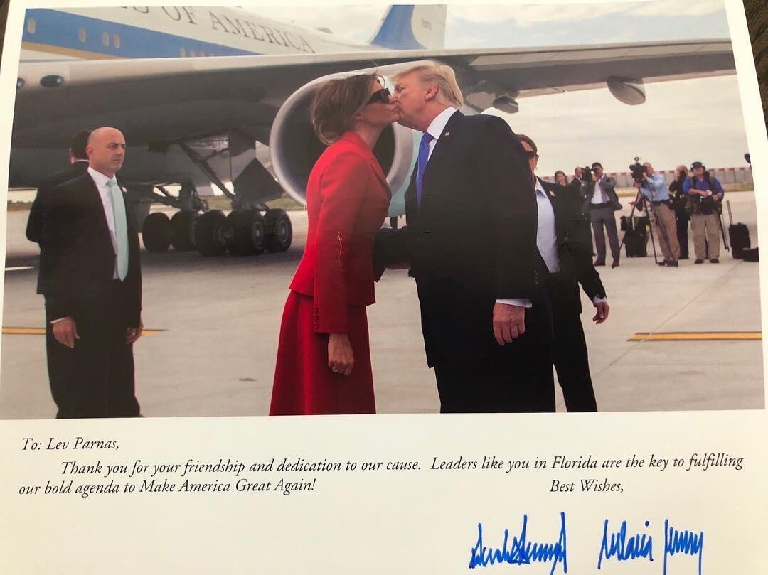 The caption: “Fraud Guarantee pow wow at Lique The atmosphere TRUMPS the rest!”In August of 2015, Parnas posted four photos and a video from a Trump campaign event at Doral, including this picture with Trump and his son. Then, his account jumps from 2015 to 2018. In Aug ’18, Parnas posted a pic of a personalized thank-you note from POTUS & FLOTUS. “Lev Parnas, Thank you for your friendship and dedication to our cause,” it reads. WH didn’t respond to request for comment.