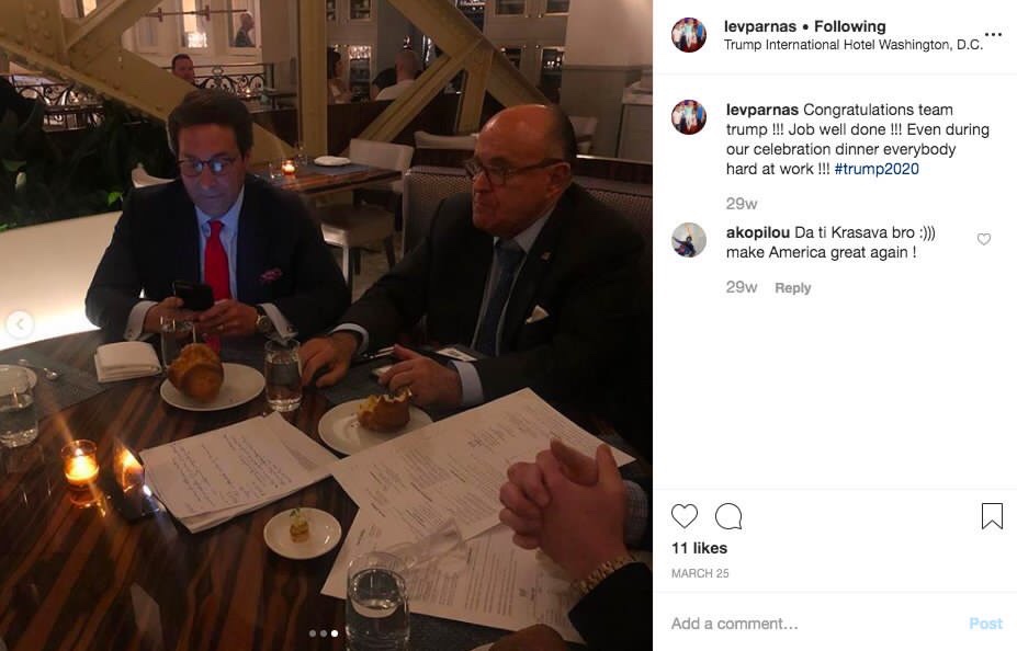On March 25, the day after Barr released a summary of the Mueller report, Parnas posted photos from what he called a celebratory dinner with the Trump legal team at Trump’s hotel in DC.