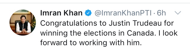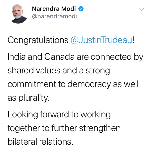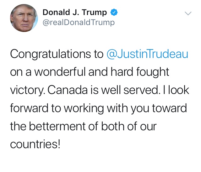 Congratulations to Justin Trudeau for winning the elections in Canada. I look forward to working with him.