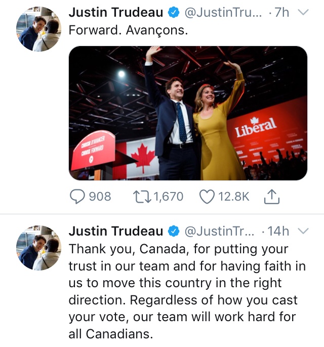 “Tonight, we chose to move Canada forward. Tonight, Canadians have charted a path for the future. And I know we will walk it together.”