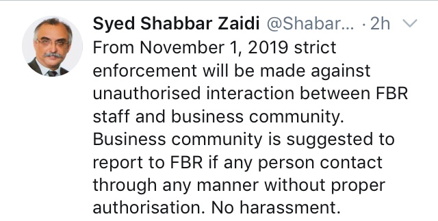 From November 1, 2019 strict enforcement will be made against unauthorised interaction between FBR staff and business community. Business community is suggested to report to FBR if any person contact through any manner without proper authorisation. No harassment.