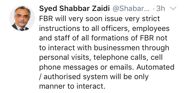 FBR will very soon issue very strict instructions to all officers, employees and staff of all formations of FBR not to interact with businessmen through personal visits, telephone calls, cell phone messages or emails. Automated / authorised system will be only manner to interact.