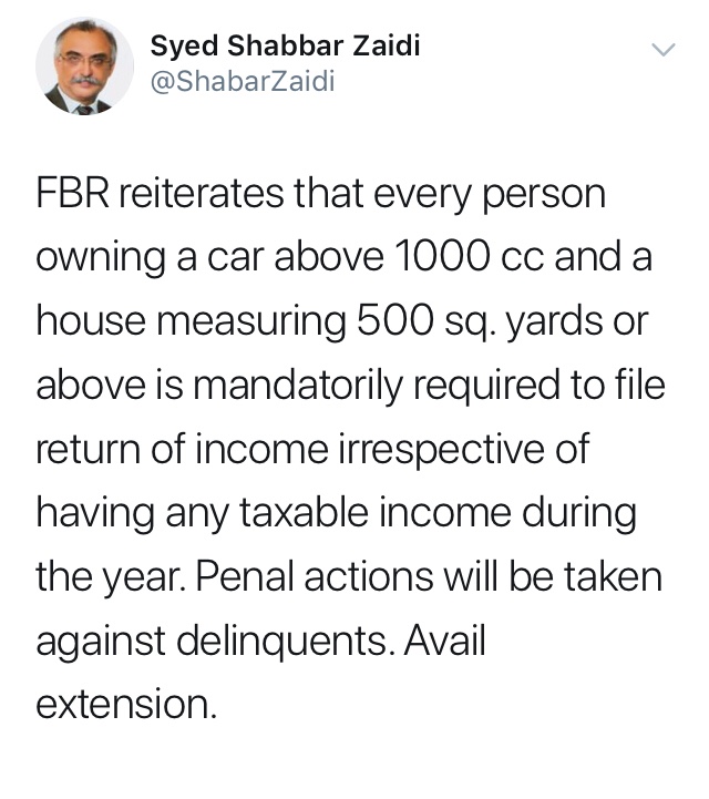FBR reiterates that every person owning a car above 1000 cc and a house measuring 500 sq. yards or above is mandatorily required to file return of income irrespective of having any taxable income during the year. Penal actions will be taken against delinquents. Avail extension.