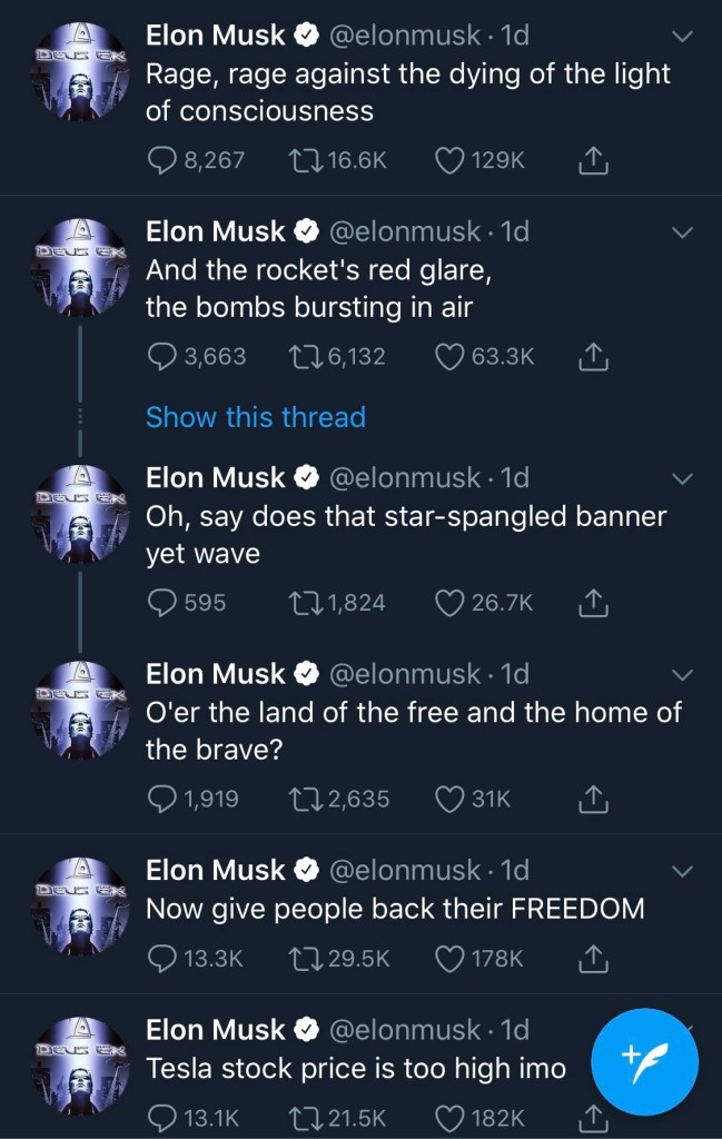 Elon musk losing his marbles! Stay at home orders are getting to everyone.