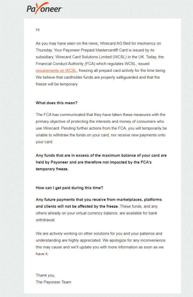 Wirecard is a subsidiary of the German company Wirecard AG that filed for insolvency on Thursday. All Payoneer Prepaid Mastercard cards are affected considering they are issued by Wirecard UK.